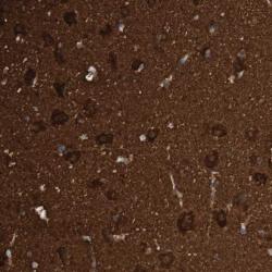 - Immunohistochemical staining of human cerebral cortex shows strong cytoplasmic positivity in neuronal cells.