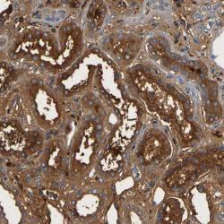 - Immunohistochemical staining of human kidney shows strong cytoplasmic and extracellular positivity in cells of tubules.