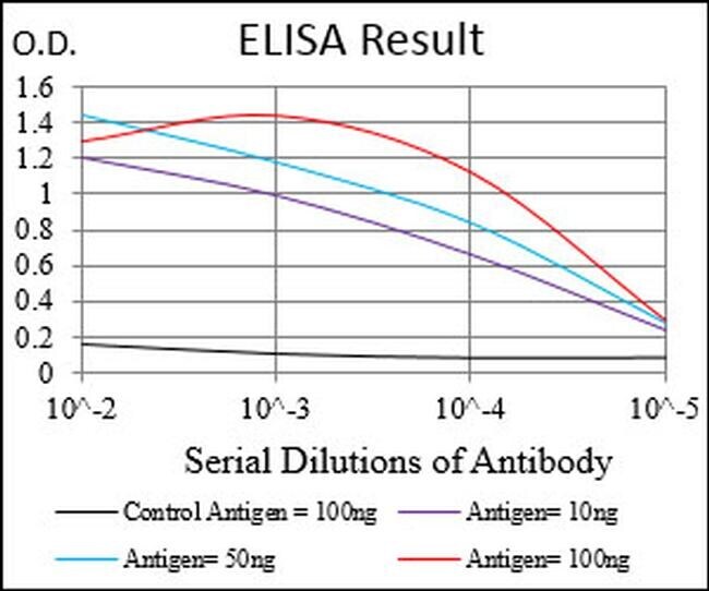 - ELISA analysis of MSTN in Control Antigen (black line, 100 ng); Antigen (purple line, 10 ng); Antigen (blue line, 50 ng); Antigen (red line, 100 ng). Samples were incubated with MSTN monoclonal antibody (Product # MA5-31803) using a dilution of 1:10,000.