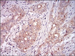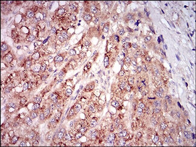 - Immunohistochemistry analysis of MSTN in paraffin-embedded liver cancer tissue. Sample was incubated with MSTN monoclonal antibody (Product # MA5-31803) using a dilution of 1:200-1:1000 followed by DAB staining.