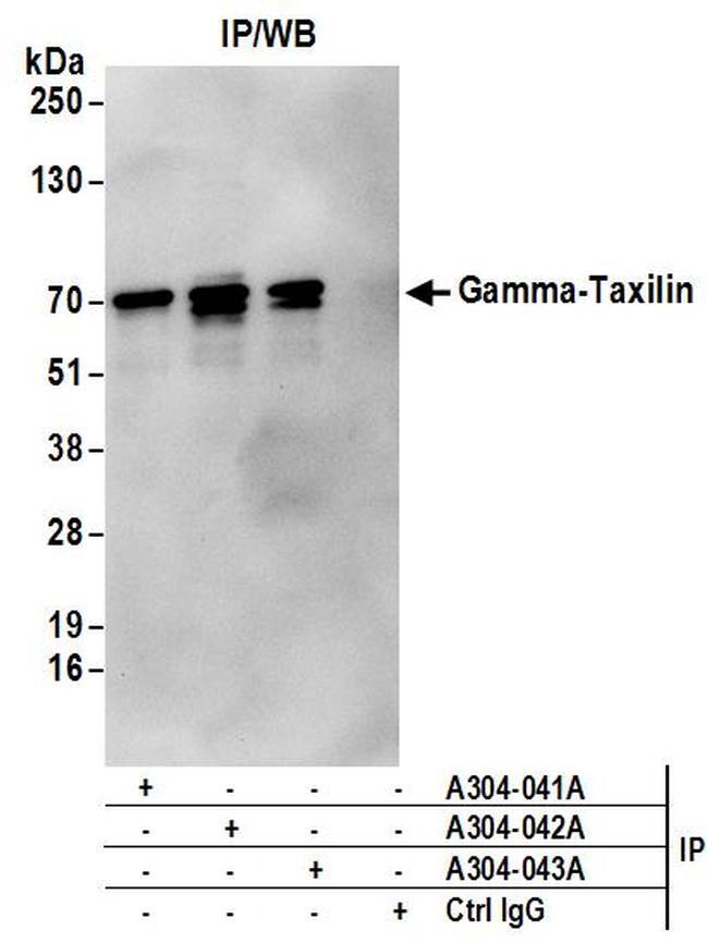 - Detection of human Gamma-Taxilin by western blot of immunoprecipitates. Samples: Whole cell lysate (1 mg for IP; 20% of IP loaded) from 293T cells. Antibodies: Affinity purified rabbit anti-Gamma-Taxilin antibody A304-042A (lot A304-042A-1) used for IP at 6 µg/mg lysate. Gamma-Taxilin was also immunoprecipitated by rabbit anti-Gamma-Taxilin antibodies A304-041A and A304-043A. For blotting immunoprecipitated Gamma-Taxilin, A304-042A was used at 1 µg/ml. Detection: Chemiluminescence with an exposure time of 10 seconds.
