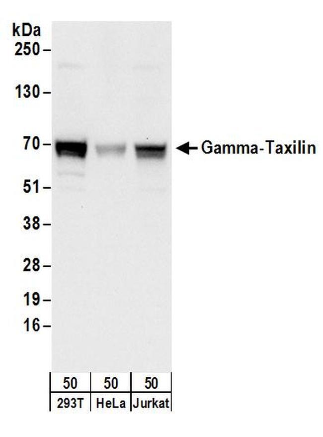 - Detection of human Gamma-Taxilin by western blot. Samples: Whole cell lysate (50 µg) from 293T, HeLa, and Jurkat cells. Antibodies: Affinity purified rabbit anti-Gamma-Taxilin antibody A304-042A (lot A304-042A-1) used for WB at 0.1 µg/ml. Detection: Chemiluminescence with an exposure time of 10 seconds.