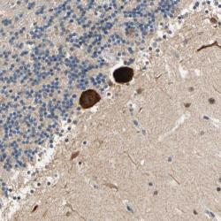 - Immunohistochemical staining of human cerebellum shows strong cytoplasmic positivity in purkinje cells.