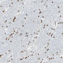 - Immunohistochemical staining of human lateral ventricle shows distinct nuclear positivity in glial cells.