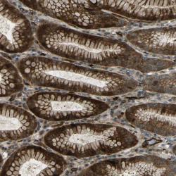 - Immunohistochemical staining of human stomach shows strong cytoplasmic positivity in glandular cells and endothelial cells.