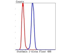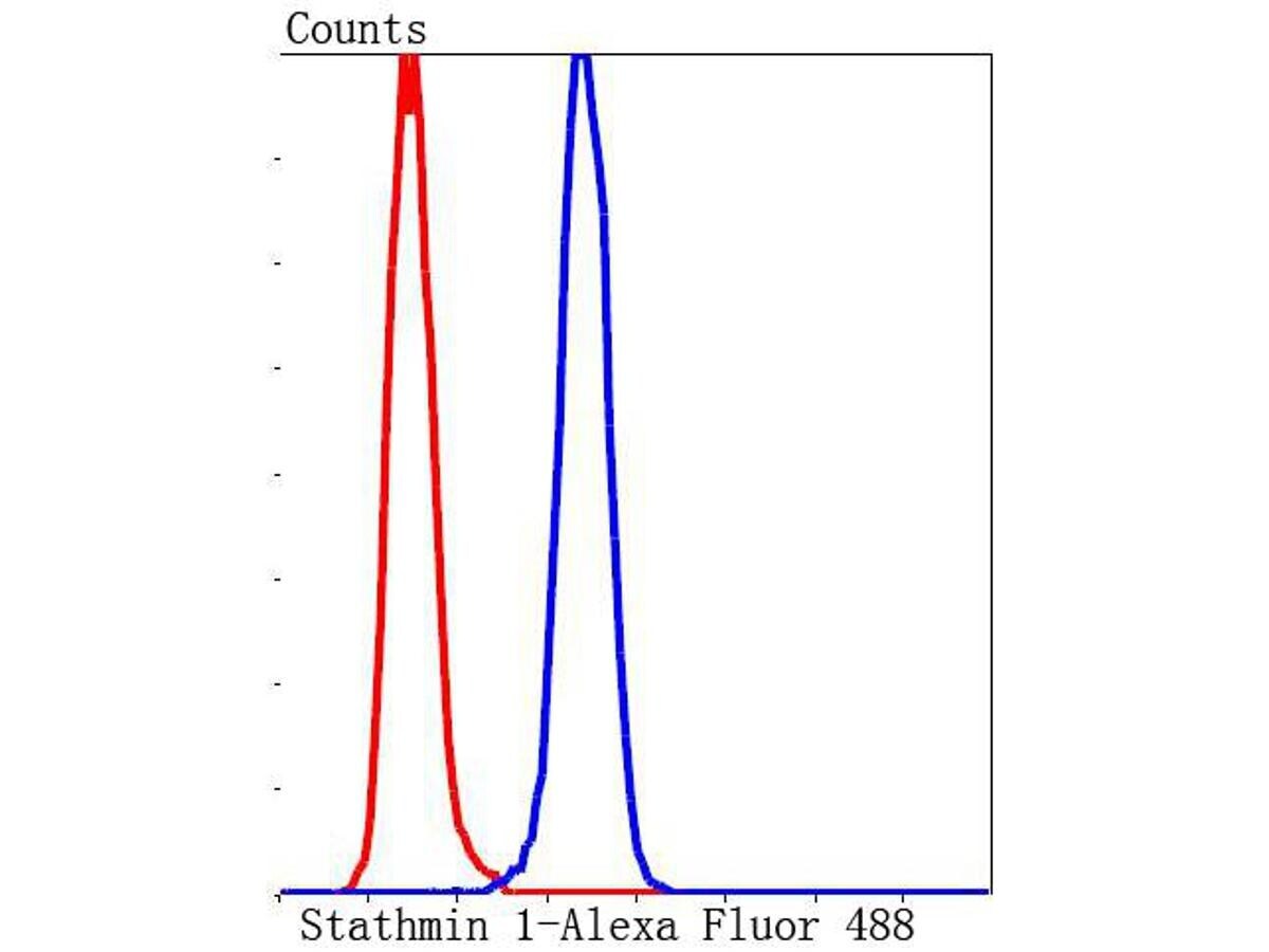 - Flow Cytometry analysis of Stathmin-1 in Hela cells. The cells were fixed, permeabilized and stained with Stathmin 1 Recombinant Monoclonal Antibody (Product # MA5-41130) at a dilution of 1:50 (blue). Alexa Fluor 488-conjugated goat anti rabbit IgG was used as the secondary antibody. Unlabelled control (cells without incubation with primary antibody; red).