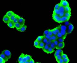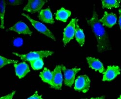 - Immunocytochemistry/Immunofluorescence analysis of Stathmin-1 in Hela cells (green) using Stathmin 1 Recombinant Monoclonal Antibody (Product # MA5-41130). Cells were fixed in paraformaldehyde, permeabilised with 0.25% Triton X100/PBS. The nuclear counter stain is DAPI (blue).