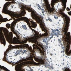 - Immunohistochemical staining of human placenta shows strong cytoplasmic positivity in trophoblastic cells.