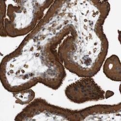 - Immunohistochemical staining of human placenta shows strong cytoplasmic positivity in trophoblastic cells.