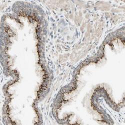 - Immunohistochemical staining of human prostate shows strong cytoplasmic positivity in glandular cells.