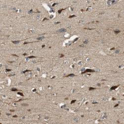 - Immunohistochemical staining of human cerebral cortex shows strong cytoplasmic positivity in neuronal cells.