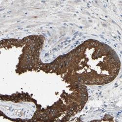 - Immunohistochemical staining of human prostate shows strong cytoplasmic positivity in glandular cells.