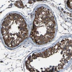 - Immunohistochemical staining of human testis shows strong cytoplasmic positivity in cells of seminiferus ducts.