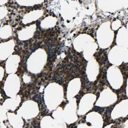 - Immunohistochemical staining of human bone marrow shows strong cytoplasmic positivity in bone marrow poietic cells.