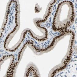 - Immunohistochemical staining of human gall bladder shows strong nuclear positivity in glandular cells.
