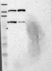 - Band of predicted size in kDa (+/-20%) with additional bands present.