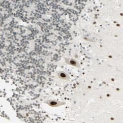 - Immunohistochemical staining of human cerebellum shows strong nuclear positivity in purkinje cells.