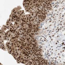 - Immunohistochemical staining of human urinary bladder shows strong nuclear positivity in urothelial cells.