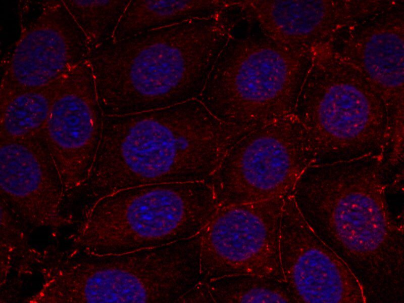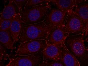 - Immunofluorescence staining of methanol-fixed MCF-7 cells using IGF-1R (pTyr1161) polyclonal antibody (Product # PA5-37601) (red).