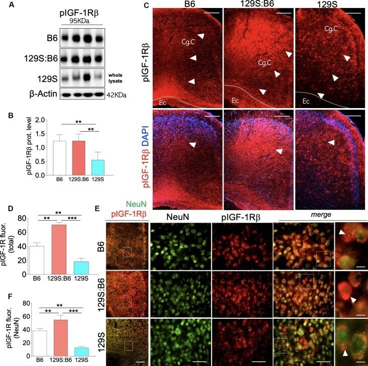 - Figure 3 Prefrontal cortex (PFC) expression of pIGF-1Rbeta in 129S:B6 and 129S mice. (A) Representative western blots for pIGF-1Rbeta detection in prefrontal cortical whole tissue lysate. (B) One-Way ANOVA comparison of normalized cortical pIGF-1Rbeta expression. (C) Low magnification immunofluorescence images demonstrating an increase in pIGF-1Rbeta expression in the 129S:B6 PFC, and a decrease in the 129S cortex (scale bar = 200 mum; Cg. C: cingulate cortex and Ec: external capsule). (D) Bar graph comparing pIGF-1Rbeta fluorescence intensity in the PFC. (E) Double fluorescence immunolabeling for NeuN/pIGF-1Rbeta co-localization in the PFC (scale bar = 200 mum, 60 mum, and 10 mum). (F) Quantification of pIGF-1Rbeta fluorescence intensity in NeuN-labeled PFC neurons [( n = 4 to n = 6 per group; B,D,F ); ** p < 0.01 and *** p < 0.001].