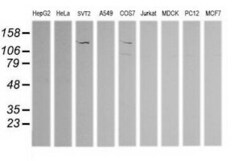 - Western blot analysis of extracts (35 µg) from 9 different cell lines by usin g anti-PIK3CG monoclonal antibody (HepG2: human; HeLa: human; SVT2: mouse; A549: human; COS7: monkey; Jurkat: human; MDCK: canine; PC12: rat; MCF7: human).