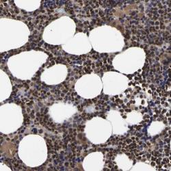 - Immunohistochemical staining of human bone marrow shows distinct nuclear and cytoplasmic positivity in bone marrow poietic cells.