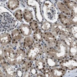 - Immunohistochemical staining of human kidney shows strong nuclear positivity in cells of tubules.
