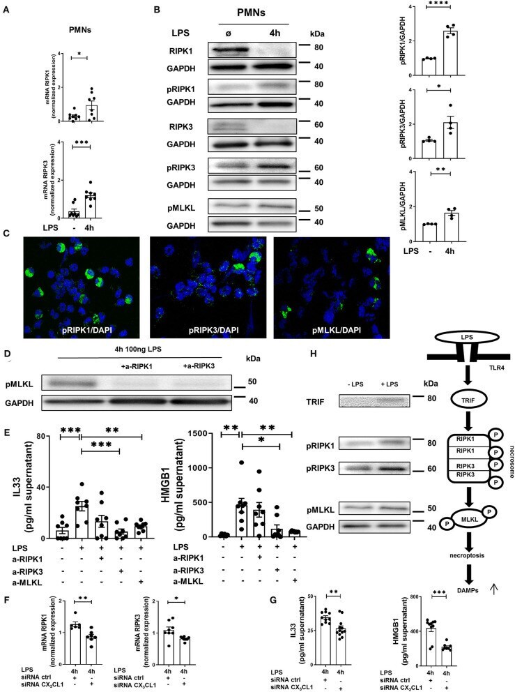 - Figure 7 In vitro necrosome activation on human PMNs. (A) Necrosome-related protein kinase RIPK1 and RIPK3 expression in human PMNs after LPS stimulation ( n = 8) was detected by RT-PCR. (B) Immunoblots of RIPK1, RIPK3, MLKL and their phosphorylated forms were obtained from cell lysates of human PMNs after LPS stimulation (representative blots of n = 4-5 are shown). The intensity of the blots was evaluated by ImageJ. (C) Phosphorylation of RIPK1, RIPK3, and MLKL was detected in human PMNs after LPS (original magnification 63x; one representative image of five is shown; n = 4). (D) Effects of specific RIPK1 and RIPK3 inhibition on MLKL phosphorylation in human PMNs after LPS exposure were evaluated (representative blots from 3 independent experiments; n = 3). (E) Human IL-33 and HMGB1 were determined in the supernatant of stimulated and treated PMNs as indicated ( n = 6-8). (F) Effects of fractalkine depletion on necrosome-related RIPK1 and RIPK3 expression in human PMNs ( n = 6-8) and on the release of human alarmins IL-33 and HMGB1 (G) were evaluated ( n = 8-12). All the data are presented as the mean +- SEM; * p < 0.05; ** p < 0.01; *** p < 0.001; Student''s t -test to compare two groups or one-way ANOVA + Bonferroni test to compare multiple groups. (H) Schematic diagram of LPS-dependent necrosome formation in human PMNs. Transmembrane toll-like receptor (TLR) 4 activates (toll/interleukin-1 receptor) domain-containing adaptor protein (TRIF), leading to the phosphorylation
