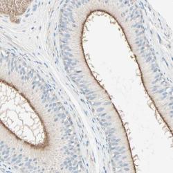 - Immunohistochemical staining of human epididymis shows distinct membranous positivity in glandular cells.