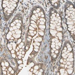 - Immunohistochemical staining of human colon shows distinct cytoplasmic positivity in glandular cells.