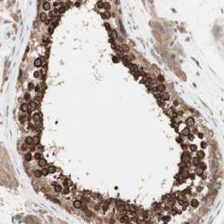 - Immunohistochemical staining of human testis shows strong cytoplasmic positivity in cells of seminiferus ducts.