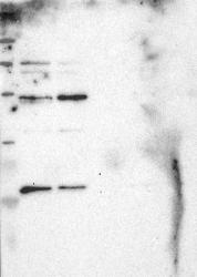 - Band of predicted size in kDa (+/-20%) with additional bands present.