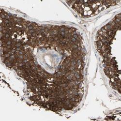 - Immunohistochemical staining of human testis shows strong cytoplasmic positivity in cells of seminiferus ducts.