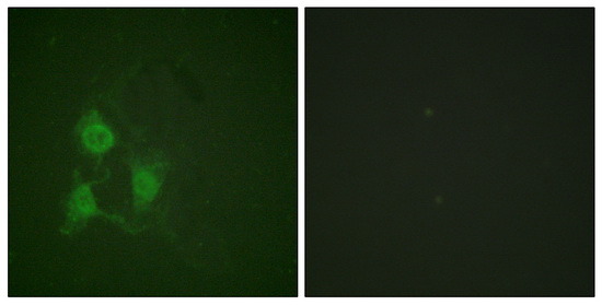 - Immunofluorescence analysis of A549 cells, using PKA α/β CAT (Phospho-Thr197) antibody. The picture on the right is treated with the synthesized peptide.