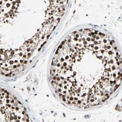 - Immunohistochemical staining of human testis shows strong nuclear and cytoplasmic positivity in cells of seminiferus ducts.
