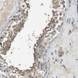 - Immunohistochemical staining of human testis shows cytoplasmic positivity in cells of seminiferus ducts.