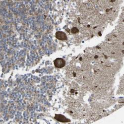 - Immunohistochemical staining of human cerebellum shows strong cytoplasmic positivity in purkinje cells.