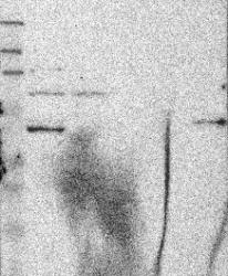 - Band of predicted size in kDa (+/-20%) with additional bands present.