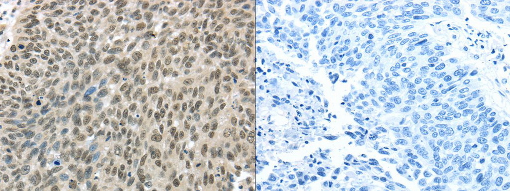 - The image on the left is immunohistochemistry of paraffin-embedded Human lung cancer tissue using (TBL1Y Antibody) at dilution 1/20, on the right is treated with fusion protein. (Original magnification: ?200)