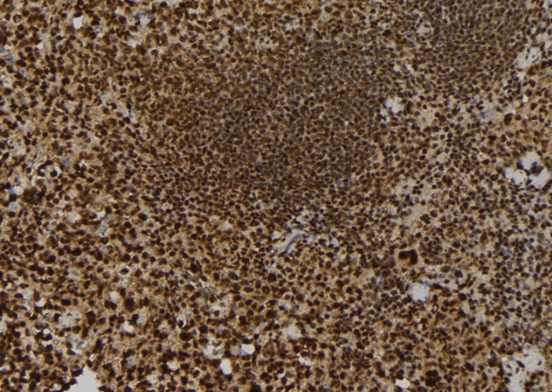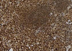 - Immunohistochemistry analysis of paraffin-embedded KIF23 in mouse spleen tissue. Antigen retrieval was performed using citrate buffer. Samples were blocked with blocking buffer (1.5 hr, 22°C), incubated with KIF23 polyclonal antibody (Product # PA5-100863) using a dilution of 1:100 (1.5 hr, 22°C), followed by HRP conjugated goat anti-rabbit.