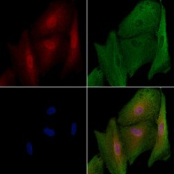 - Immunocytochemistry analysis of KIF23 in A549 cells. The samples were fixed with PFA and permeabilized in 0.1% Triton X-100, then blocked in 10% serum for 45 minutes at 25°C. Samples were incubated with KIF23 polyclonal antibody (Product # PA5-100863) and mouse anti-beta tubulin antibody for 1 hour at 37°C. An AlexaFluor594 conjugated goat anti-rabbit IgG(H+L) (Red) and an AlexaFluor488 conjugated goat anti-mouse IgG(H+L) (Green) were used as the secondary antibodies. The nuclear counter stain is DAPI (blue).