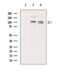 - Western blot analysis of KIF23 in extracts from various samples. Samples were incubated with KIF23 polyclonal antibody (Product # PA5-100863). Lane 1: A549 cells (serum starvation treatment), blocked with antigen-specific peptides; Lane 2: A549 cells (serum starvation treatment); Lane 3: K562 cells (serum starvation treatment).