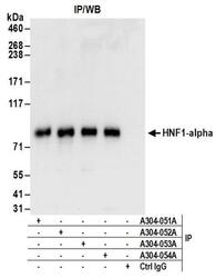 - Detection of human HNF1-alpha by western blot of immunoprecipitates. Samples: Whole cell lysate (1 mg for IP; 20% of IP loaded) from Hep G2 cells. Antibodies: Affinity purified rabbit anti-HNF1-alpha antibody A304-051A (lot A304-051A-1) used for IP at 6 µg/mg lysate. HNF1-alpha was also immunoprecipitated by rabbit anti-HNF1-alpha antibodies A304-052A, A304-053A, and A304-054A. For blotting immunoprecipitated HNF1-alpha, A304-053A was used at 1 µg/ml. Detection: Chemiluminescence with an exposure time of 3 seconds.