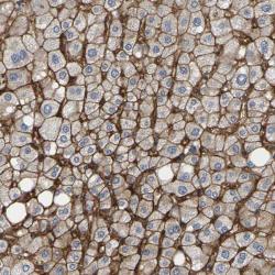 - Immunohistochemical staining of human liver shows strong membranous positivity in hepatocytes.