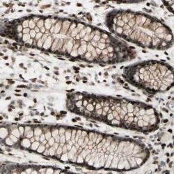 - Immunohistochemical staining of human rectum shows strong nuclear and cytoplasmic positivity in glandular cells.