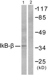- Western blot analysis of extracts from NIH/3T3 cells, treated with TNF (20ng/ml, 30mins), using I?B-ß (Ab-19) antibody.