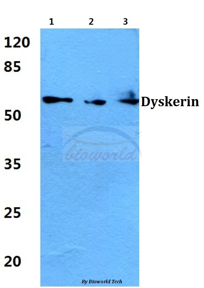 - Western blot (WB) analysis of Dyskerin (K203) pAb at 1:500 dilutionLane1:A549 cell lysateLane2:Mouse brain tissue lysateLane3:Rat brain tissue lysate