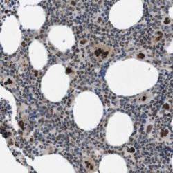 - Immunohistochemical staining of human bone marrow shows strong nuclear positivity in megakaryocytes.