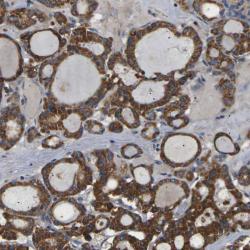 - Immunohistochemical staining of human thyroid gland shows strong cytoplasmic positivity in glandular cells.