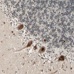 - Immunohistochemical staining of human cerebellum shows strong nuclear and cytoplasmic positivity in purkinje cells.
